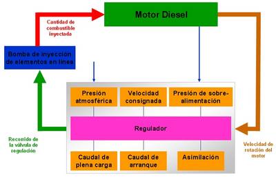 El regulador tiene la misión de mantener una determinada velocidad de giro del motor, independientemente de las variaciones de carga a las que esté sometido. Asegura además la protección del motor evitando que se "pase de vueltas" o, por el contrario, que se pare cuando trabaja sin carga, es decir, al ralentí. Todos los motores diesel necesitan pues un regulador de velocidad. Puede ser parte de la bomba (bombas rotativas), parte del equipo de inyección (bombas en línea), parte del motor (bombas individuales, PF..) o la propia unidad de control electrónica (gestiones electrónicas actuales).