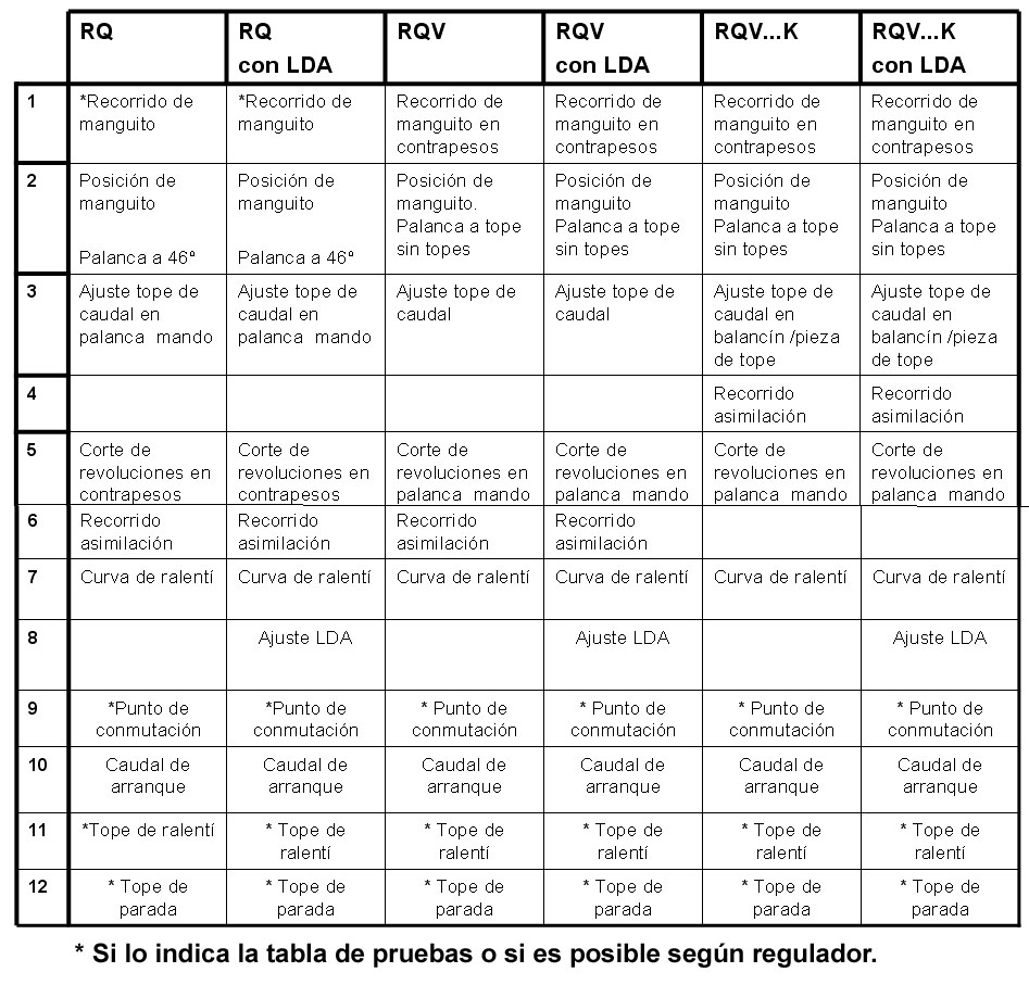 Después de realizar el ajuste de comienzo de suministro, ajuste básico de caudales y desarrollo de caudales, que son pruebas que afectan exclusivamente a la bomba, éste sería el orden a seguir para el ajuste de los reguladores en función del tipo.