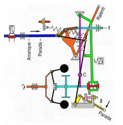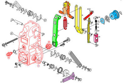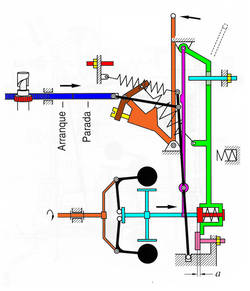 El manguito del regulador va unido directamente a la cremallera por medio de la combinación de palanca de guía y palanca de regulación, esto significa que siempre que se desplace el manguito de regulación empujado por los contrapesos, la cremallera también lo hará.