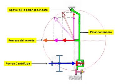 Cuando la palanca de mando está en posición de ralentí, básicamente lo que varía es la tensión del muelle de regulación, que queda prácticamente suelto. Este hecho determina, que con las revoluciones de ralentí el manguito ya es capaz de desplazar la palanca tensora. Como el muelle de regulación es muy robusto, se muestra poco sensible a la variación de revoluciones en el margen de ralentí, por ello se tiene que combinar con el muelle de ralentí adicional.
