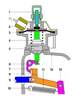 La posición de la palanca de mando no solo hace variar la precarga del muelle de regulación, sino que también, al variar la posición angular del muelle de regulación, varía la eficacia de su fuerza.
