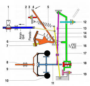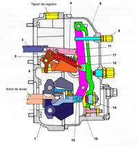 4.- Muelle de ralentí adicional, que en esta situación (palanca de mando sobre el tope de revoluciones) se sumaría a la fuerza del muelle de regulación, pero sin ningún efecto sobresaliente.