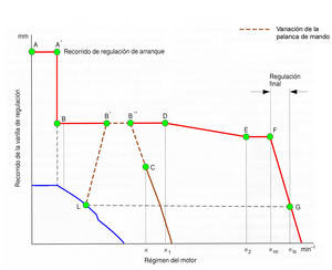 Los puntos de esta línea relacionan la posición de la cremallera con las revoluciones. Cuanto mayor es el número de revoluciones necesario (nIo – nvo) para pasar desde la posición de la cremallera de máximas revoluciones con carga (F) a las máximas revoluciones sin carga (G), mayor es el estatismo de un regulador, es decir más lento o “suave”.