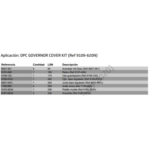 Equivalencias para 9109-620N Kit Tapa de regulador bomba DPC y juego de juntas